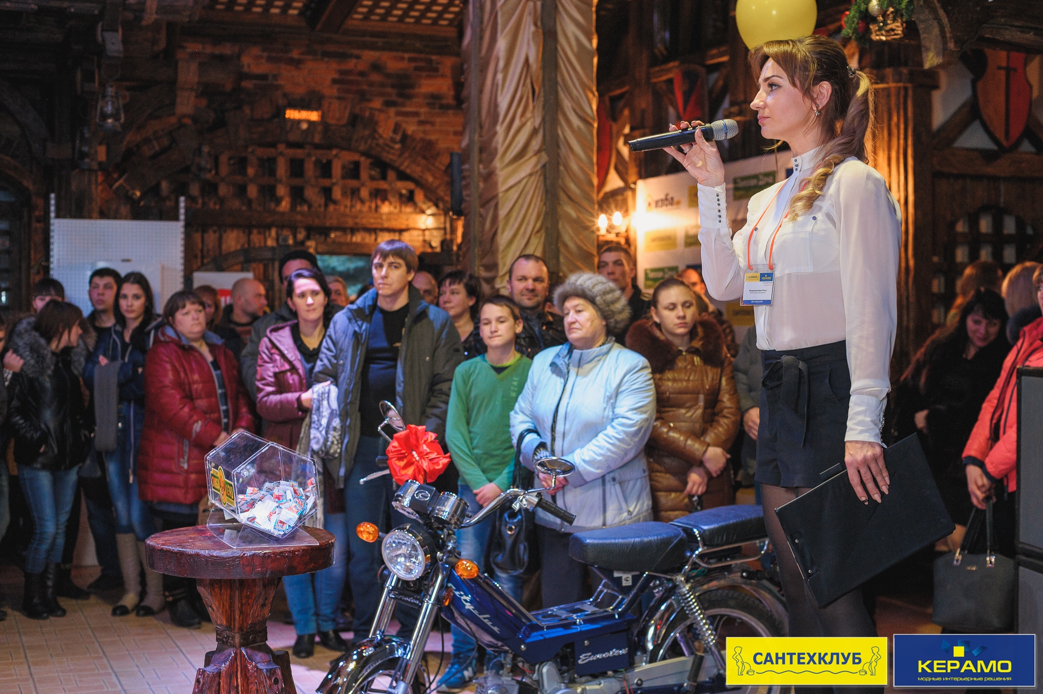 Розыгрыш проходил в ресторане Замок "Камелот", при участии ведущей, шоу-группы и фотооператора. Кроме того присутствовал представилель компании Electrolux, который рассказал об особенностях данной продукции, а так же вручил подарки постоянным покупателям магазинов Сантехклуб, Керамо и Теплая Дача. Наши клиенты наслаждались фуршетом и горячительными напитками. Всего было разыграно более тридцати подарков: два мопеда, отопительные и климатические приборы, электро-инструмент, мелкая бытовая техника, денежные сертификаты.