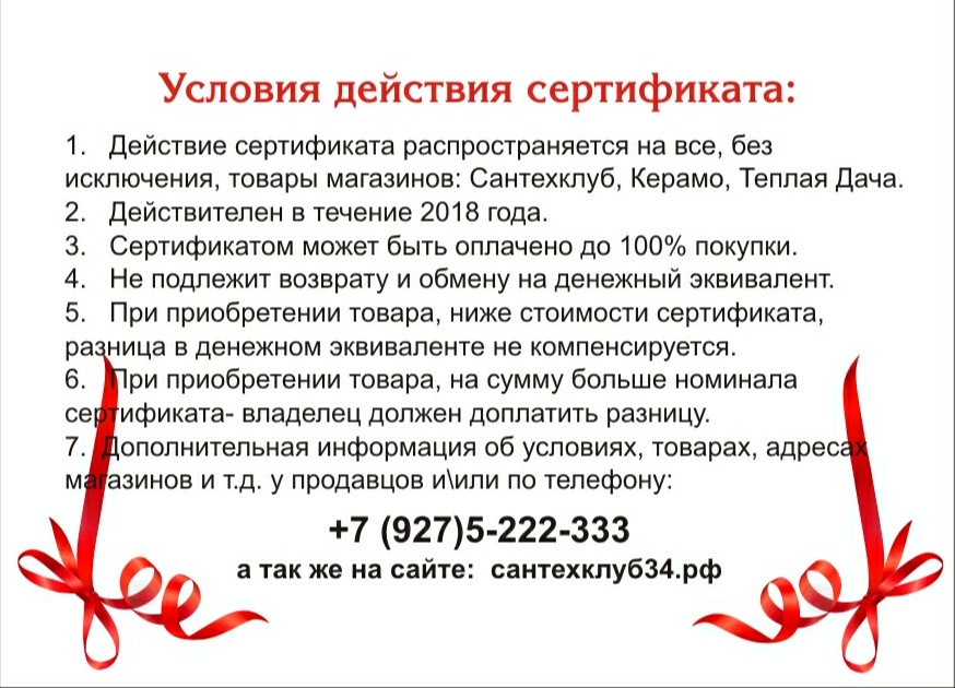 Подробную информацию можно узнать у организатора ИП Мирошниченко Д.С. по телефону 8(927)5-222-333, на кассе магазинов или на сайте www/сантехклуб34.рф
